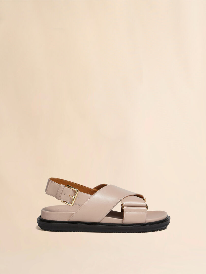 Iconic Fussbett crisscross sandal in smooth calf leather with rectangular rings and back strap with metal buckle. Gold hardware. Leather insole. Iconic sole in leather with a central layer in micro, outsole in jute.