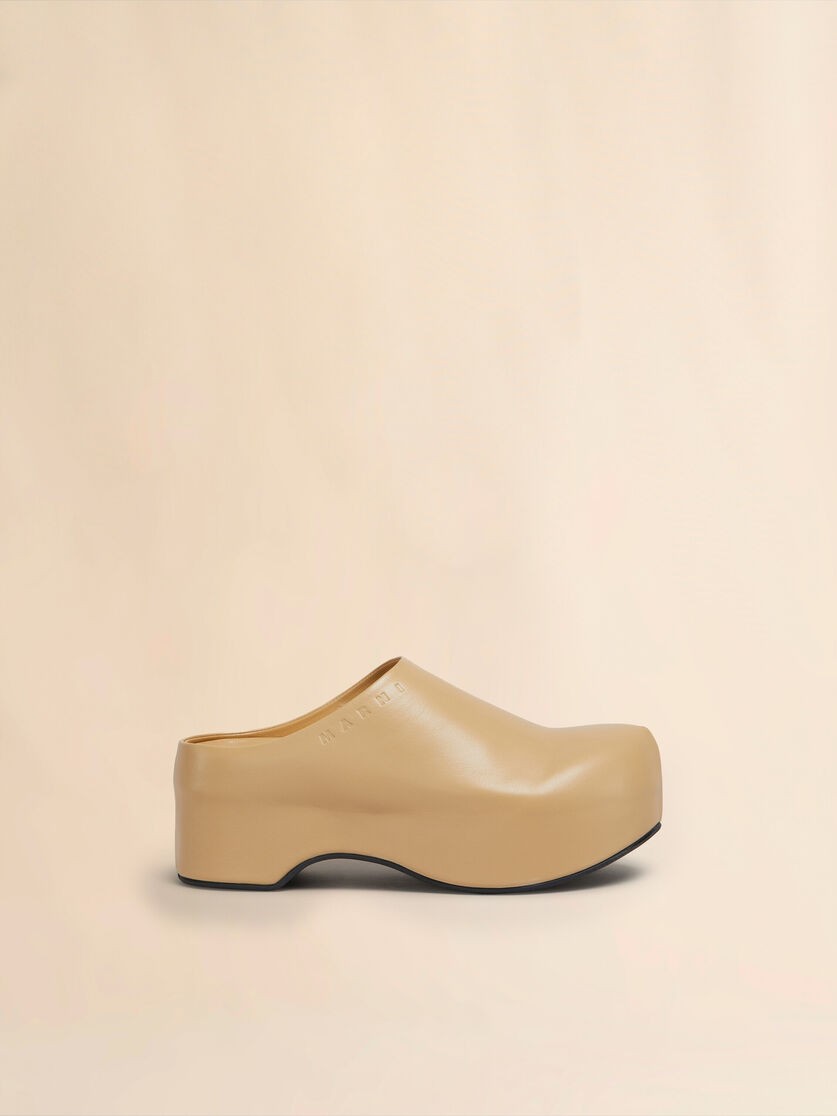 Chunky clog sabot with lightweight wooden platform sole, covered entirely in sleek nappa leather. Subtly embellished with debossed Marni lettering along the edge. Leather insole and ribbed rubber outsole.