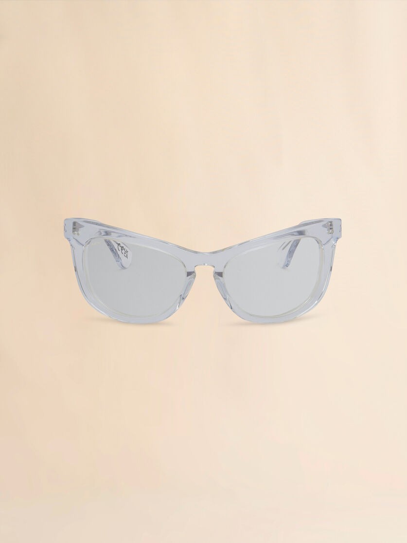 Isamu optical glasses with thick acetate rims. Innovative interpretation of classic 1950s silhouettes, flaunting a stretched V-shaped browline for a futuristic look. Clear PMMA lenses.