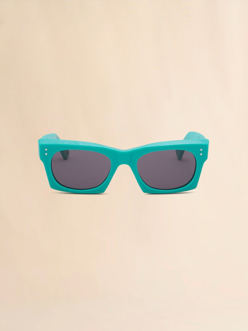 Edku sunglasses made from thick acetate, featuring oval lenses embedded within an angular frame. Bold geometric design with slanted upper rims. Embellished with Marni lettering on the temple.