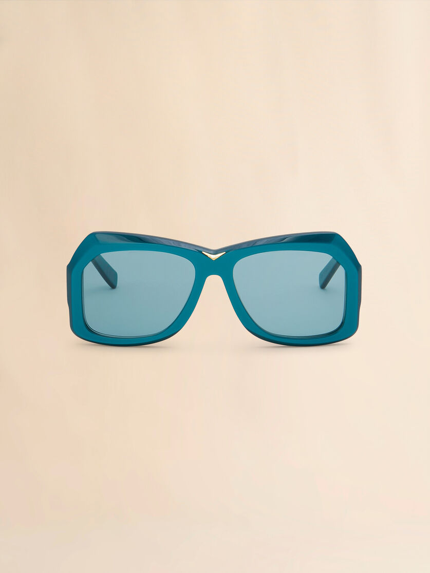 Tiznit sunglasses crafted from thick acetate. Statement silhouette with oversized lenses. Geometric design, styled with faceted rims and curved lenses. Detailed with Marni lettering on the temple.