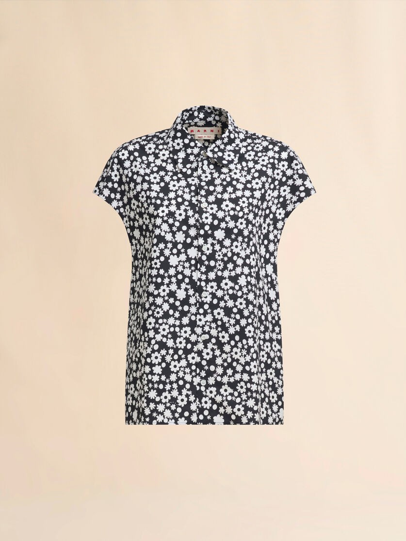 Organic cotton poplin shirt featuring this season's Pop Fields motif. The coccon silhouette is sleeveless, with a shirt collar and visible buttons along the placket.