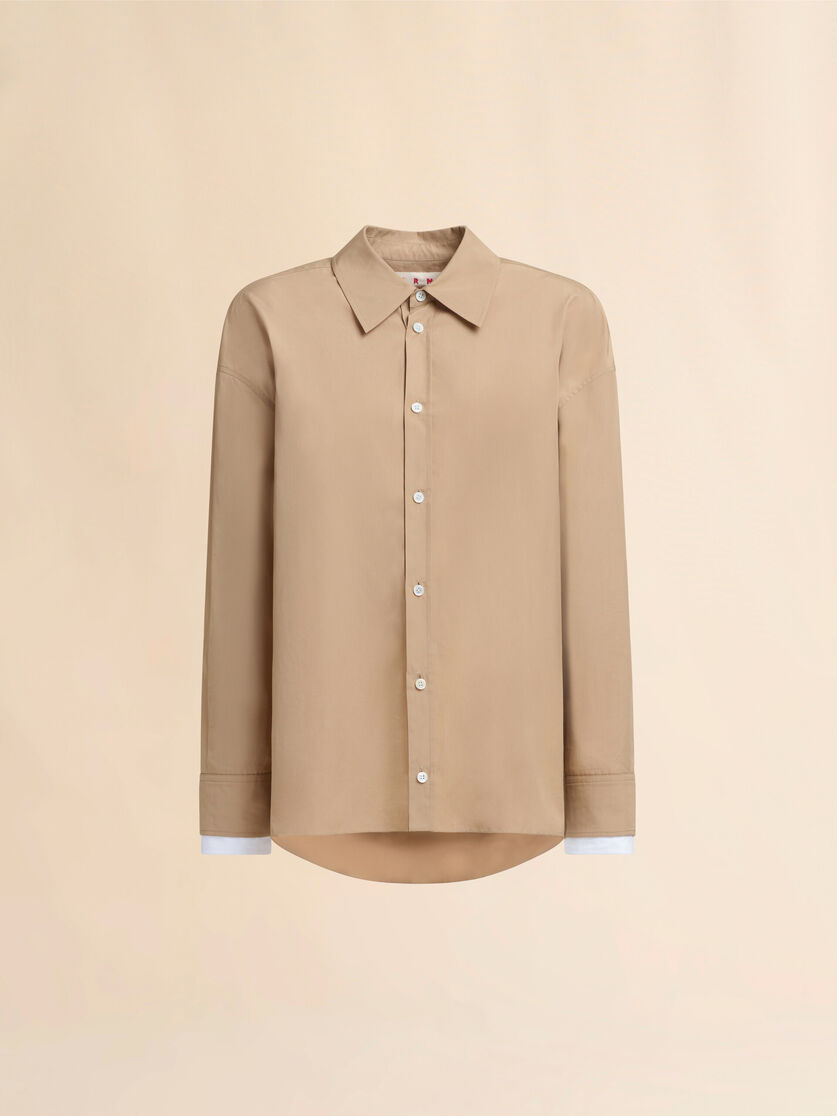 Organic cotton poplin shirt with long sleeves and a pointed collar. The cocoon silhouette has a gathered yoke at the back, and double cuffs with contrasting trim. Visible buttons along the placket and a Marni Symbol hand embroidered logo on the left shoulder.