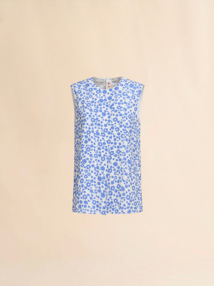 Enver satin sleeveless top featuring this season's Pop Fields print all over. Straight cut with crew neck and flat stitched pleats on the front. Zip closure on the back. Finished with small side slits and handmade Marni Symbol embroidered on the front.