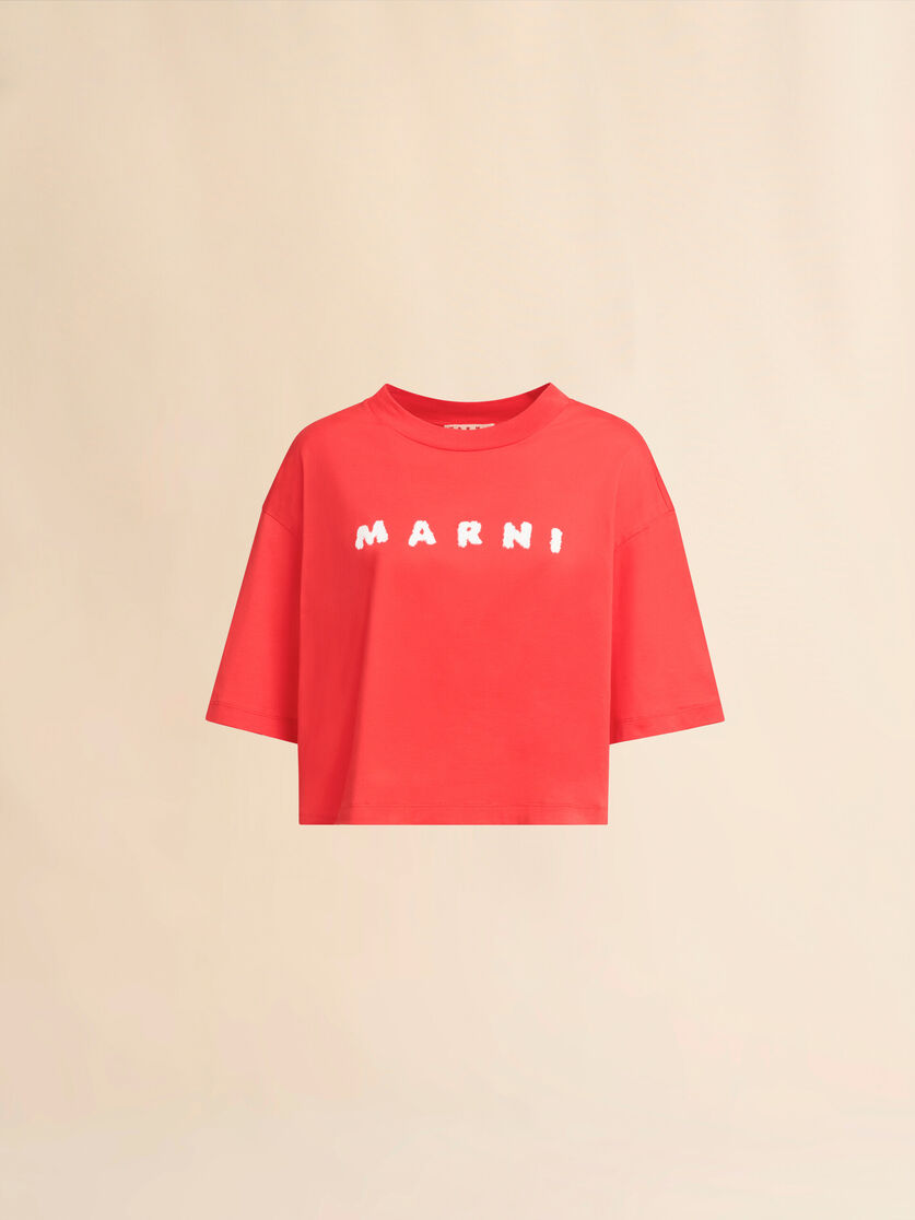 Short sleeved jersey cotton T-shirt with a boxy, cropped cut. A contrasting Marni Scribbled logo is printed on the front.