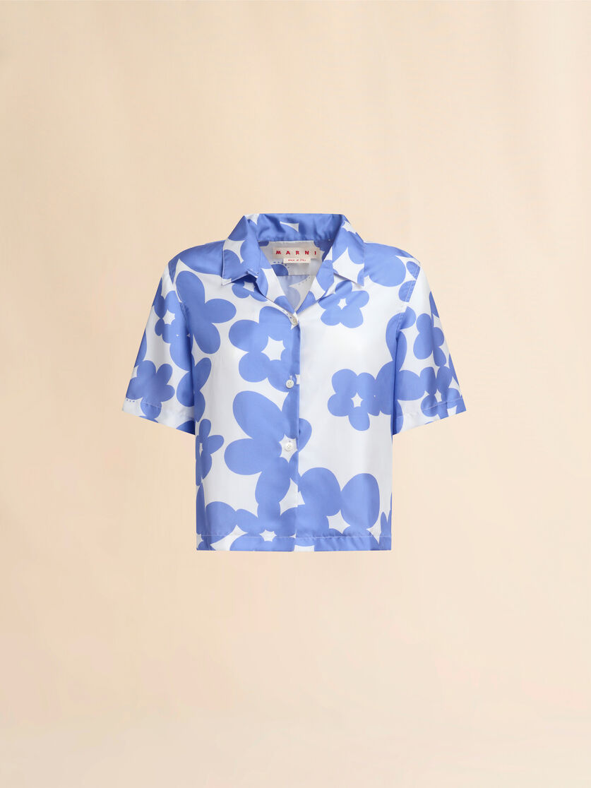 Silk twill short sleeved shirt printed all over with this season's Dillies motif. The regular fit has a straight cut hem, button up front and a bowling style collar that can be worn open or closed. The signature Marni Symbol is hand embroidered on the front.