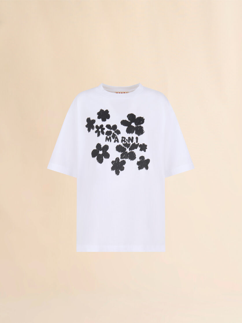 Boxy crew neck white cotton T-shirt. Seasonal Daisy Garden print and Marni logo on the front.