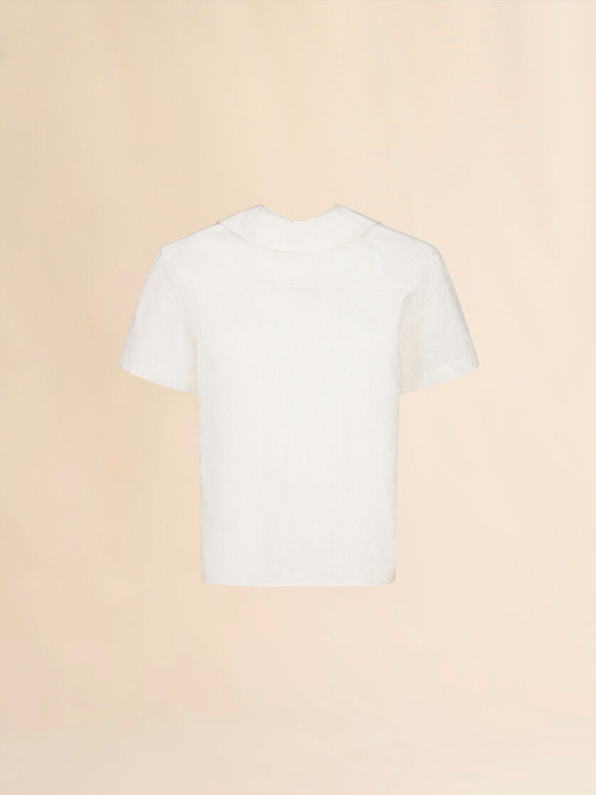 Boxy short-sleeved top made from cotton-viscose toile. Delicate jacquard design, combining a checked pattern with polka-dots. Back-to-front shirt design with buttons and Cuban collar on the back.