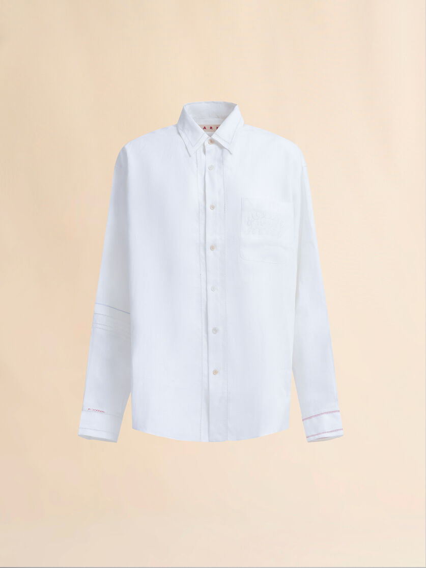 Long-sleeved shirt crafted from pure linen. Embellished with retro-style openwork embroidery along the edges and on the sleeve. Oversized fit with collar and chest pocket. Hand-embroidered Marni mending "M" detail on the right cuff.