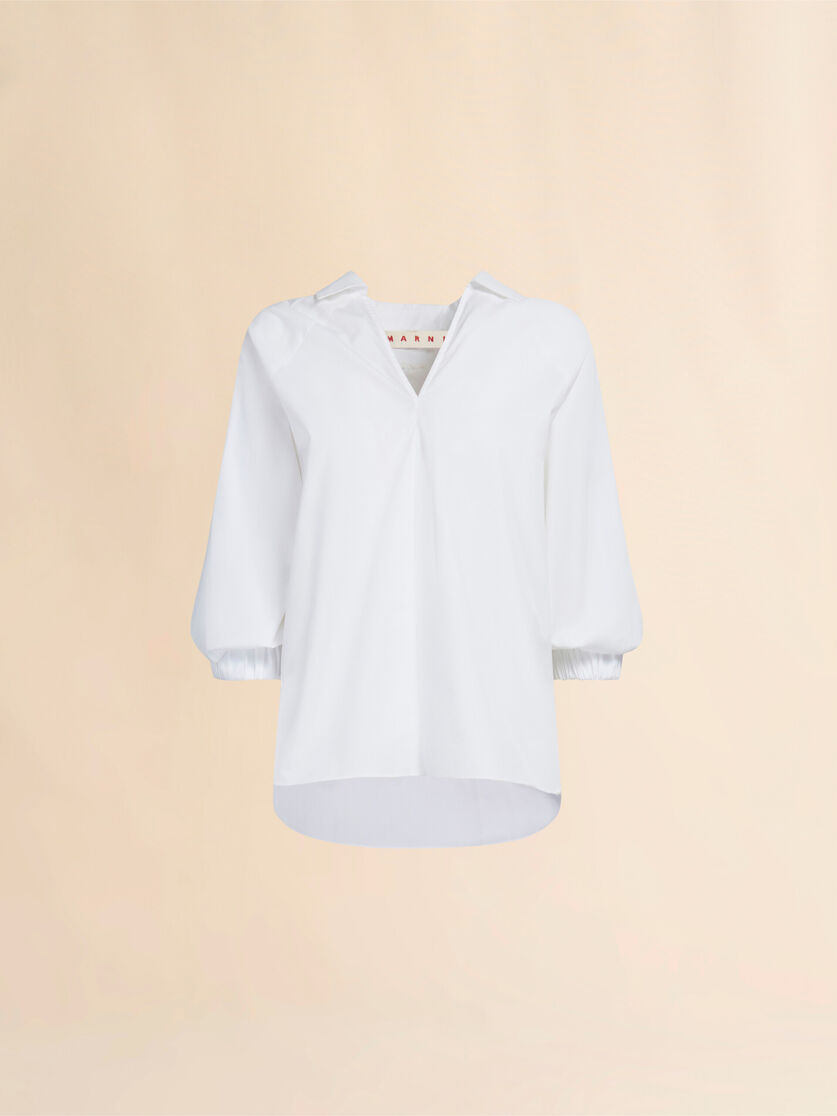 V-neck top made from organic cotton poplin with shirt collar. 3/4 sleeves with elasticated cuffs. Straight cut with lower back hem. Embroidered logo on the back.