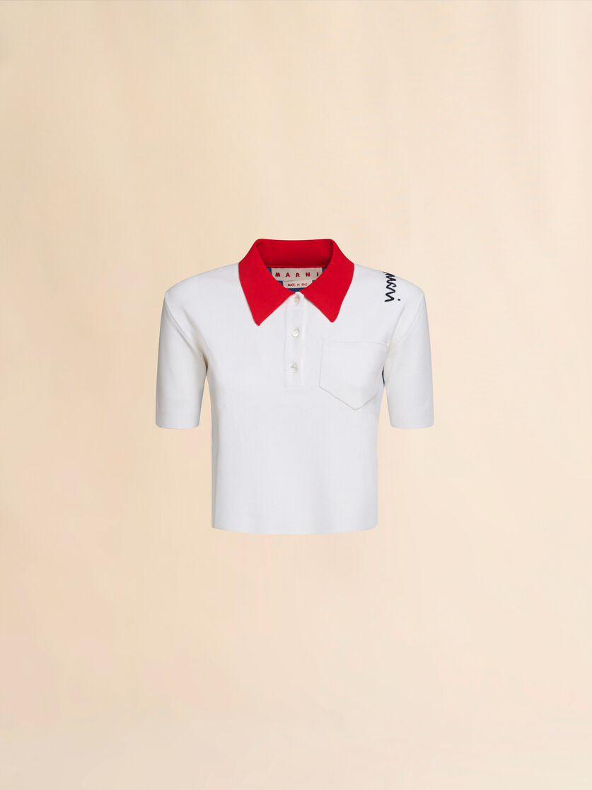 Short-sleeved polo shirt made of technical stretch viscose. Patchwork style with contrasting back and chest pocket, contrasting collar and button placket. Regular fit with inished with Marni Symbol hand embroidered on the left shoulder.