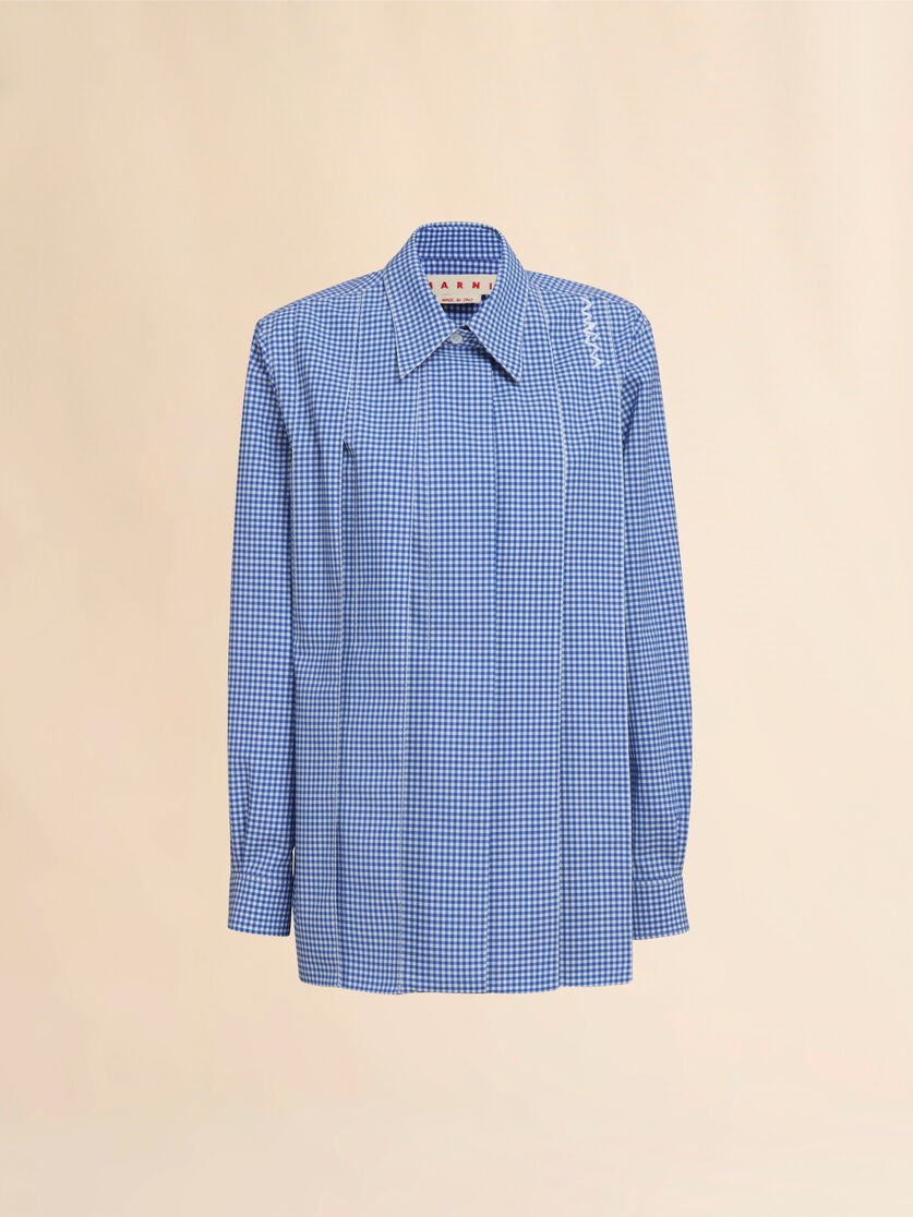 Classic long sleeved checked shirt made of a light wool blend. Cut to a regular fit, it has large pleats with stitching on the front, concealed buttons along the placket, and button up cuffs. A Marni Symbol is hand embroidered on the left shoulder.