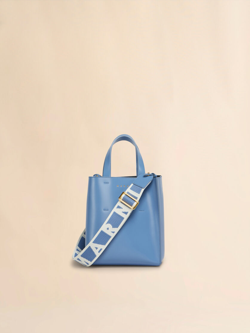 North/South tote bag, mini size, in calf leather with internal slot pocket. Fabric drawstring bag inside. Leather top handles. Detachable and adjustable recycled tape shoulder strap with Marni lettering. Monochromatic design. Gold hardware. Gold printed logo outside. Made in Italy.