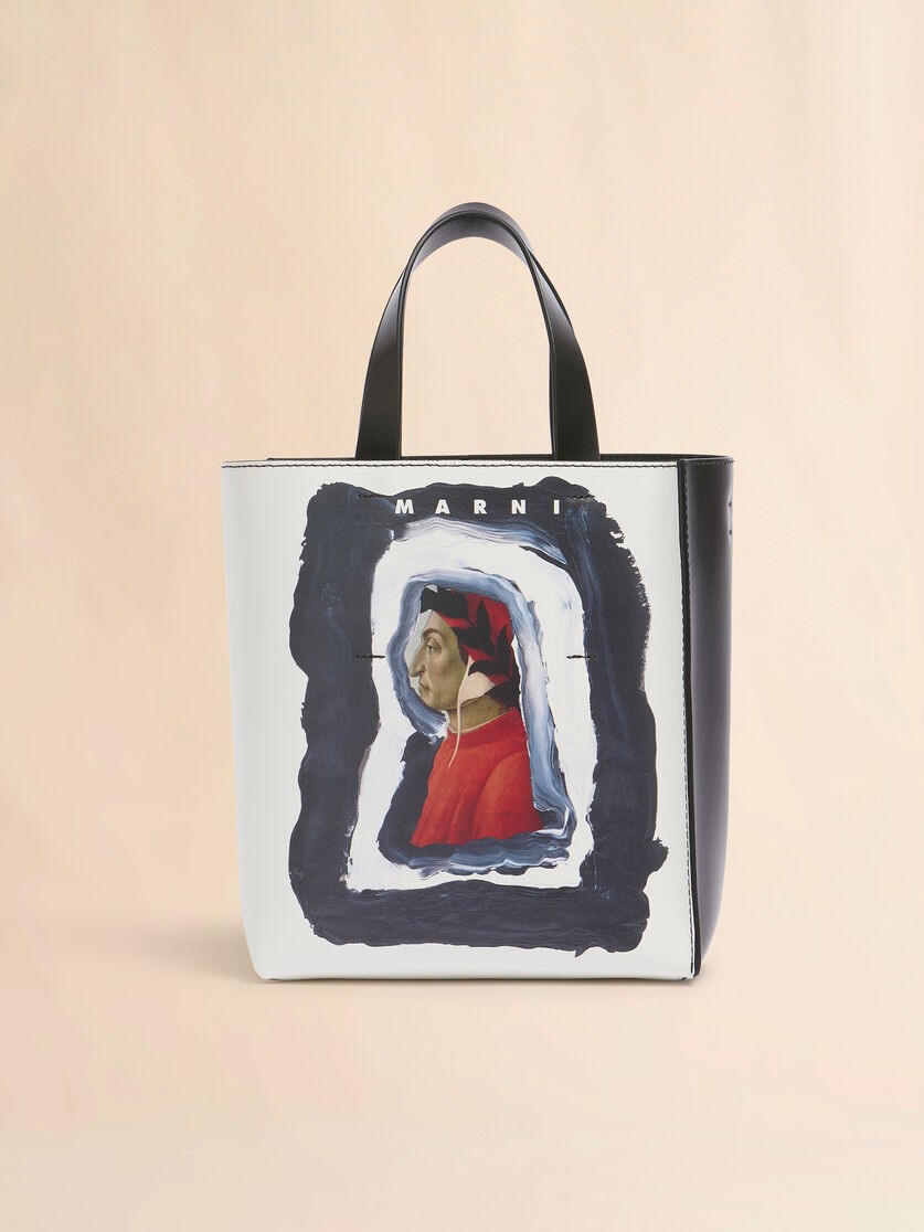 Museo North/South tote bag crafted from calfskin leather. Mini size. Colour-block design. Top handles and detachable and adjustable buckled shoulder strap. Open design with fabric lining and inside zip pocket. Front Dante print.