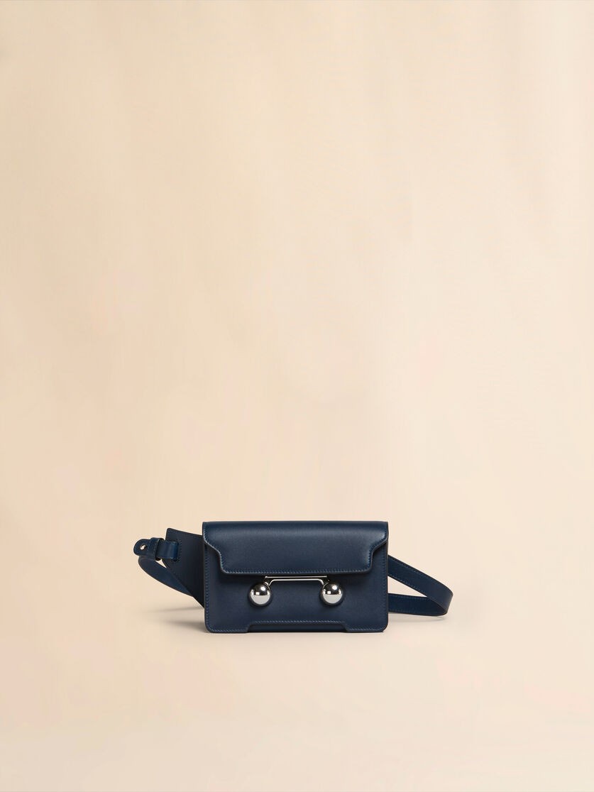 Trunkaroo crossbody bag crafted from calfskin leather. Front flap with magnetic closure, featuring engraved Marni lettering and oversized stud details. Contoured base on the front and back. One compartment with inside pocket. Lined in nappa leather. Detachable and adjustable strap: can also be worn as a clutch.