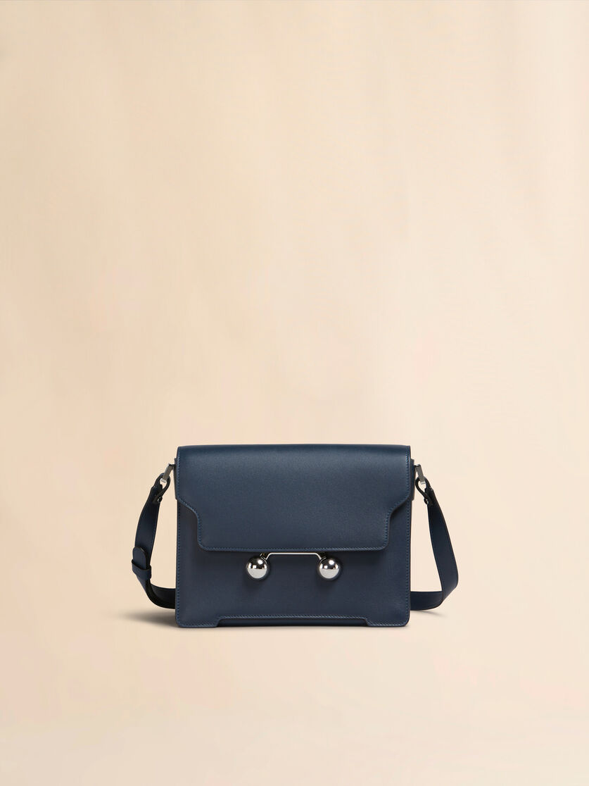 Trunkaroo medium rectangular shoulder bag crafted from calfskin leather. Front flap with magnetic closure, featuring engraved Marni lettering and oversized stud details. Contoured base on the front and back. One compartment with inside pocket. Lined in nappa leather. Detachable and adjustable buckled shoulder strap: can also be worn as a clutch.