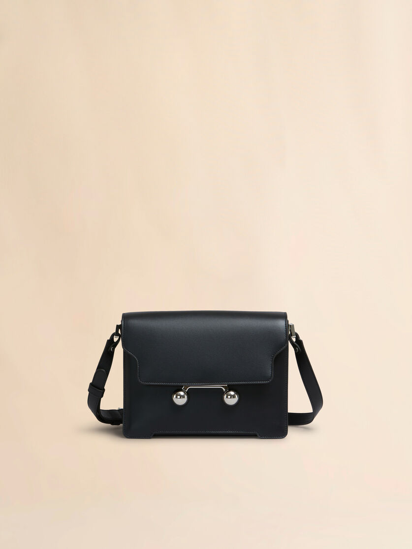 Trunkaroo medium rectangular shoulder bag crafted from calfskin leather. Front flap with magnetic closure, featuring engraved Marni lettering and oversized stud details. Contoured base on the front and back. One compartment with inside pocket. Lined in nappa leather. Detachable and adjustable buckled shoulder strap: can also be worn as a clutch.