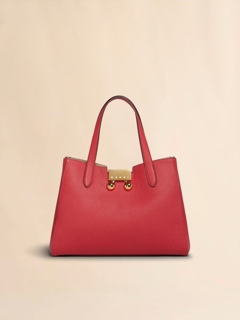 Trunkaroo Tote bag made of pebbled calf leather. Small size. Double handle and adjustable, removable leather shoulder strap. Oversized magnetic closure featuring engraved Marni lettering and two visually impactful metal stud details. Accordion-style design with suede interior and central zip pocket. Gold hardware.